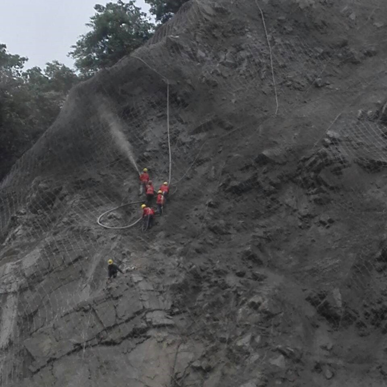 項(xiàng)目組臨危不亂,發(fā)揮專業(yè)所長(zhǎng),迅速確定了滑坡應(yīng)急搶險(xiǎn)實(shí)施方案:坡面清危+隨機(jī)錨桿淺層錨固+巖縫、凹槽注漿加固+表層淋漿硬化+GPS-2主動(dòng)防護(hù)網(wǎng)防護(hù)+C20細(xì)石混凝土噴射,方案得到了現(xiàn)場(chǎng)專家組及相關(guān)單位的一致認(rèn)同。搶險(xiǎn)現(xiàn)場(chǎng)立刻成立了技術(shù)組、交通協(xié)調(diào)組、主動(dòng)防護(hù)網(wǎng)安裝組、混凝土噴射組、材料二次搬運(yùn)組、后勤組等小組,各司其職,各履其責(zé),緊急而有條不紊地按搶險(xiǎn)方案開始施工。