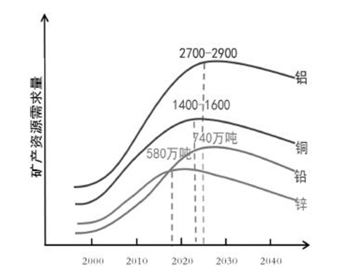 王安建教授預(yù)測(cè),達(dá)到峰值的礦產(chǎn)需求總量會(huì)很高。預(yù)計(jì)鋼鐵消費(fèi)的峰值大致是在7億噸~7.5億噸;能源消費(fèi)的峰值大約出現(xiàn)在2030年,大約消費(fèi)40億~42億噸;我國(guó)銅的消費(fèi)峰值大致在2022年~2025年,大約消費(fèi)1300萬噸~1500萬噸;鋁的消費(fèi)峰值大致在2022年~2025年, 消費(fèi)2700萬噸~2900萬噸;鉛、鋅的消費(fèi)峰值大致在2022年左右,鉛大約消費(fèi)680萬噸~700萬噸,鋅大約消費(fèi)770萬噸~790萬噸。