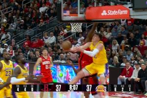 GIF-卡佩拉籃下防守拉拉維亞 拉拉維亞拉桿被筐帽 但是裁判認(rèn)定有身體接觸在先 火箭挑戰(zhàn)失敗