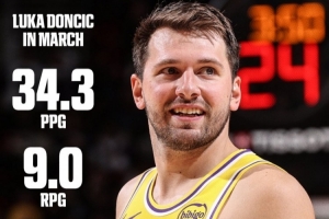 東契奇三月場均砍下34.3分9.0籃板7.7助攻,帶領(lǐng)球隊取得8勝1負的戰(zhàn)績。