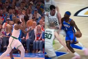 比賽中,SGA在一次合球掛手臂造成犯規(guī)后,杰倫·布朗當即對裁判表示:“這不是籃球?!?/p>