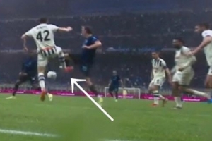 VAR裁判室: “讓我看之前那個(gè)角度:這里他踢到了球,國(guó)米球員也碰到了。動(dòng)作很輕。讓我看動(dòng)態(tài)回放:他的腿是彎曲的……檢查完畢,動(dòng)作很輕,雖然有接觸但非常輕微。觸碰極小,并不是踢了一腳。”