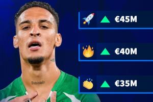 德轉給出了安東尼身價變化的4個選項:3200萬歐、3500萬歐、4000萬歐、4500萬歐;目前安東尼的身價為3000萬歐元,他也將確定迎來身價上漲。