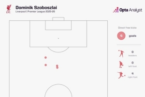 索博斯洛伊本賽季在英超聯(lián)賽中已經(jīng)直接通過任意球打入四球。此前,貝克漢姆(2000-01賽季)和勞倫特·羅伯特(2001-02賽季)在一個英超賽季中通過任意球打入五球。