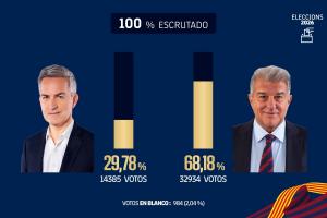 體育資訊3月16日訊 每體報道,拉波爾塔在巴塞羅那俱樂部主席選舉中再次大獲全勝,獲得32934票,占總票數(shù)的68.18%。維克托·豐特以14385票(29.78%)位居第二。